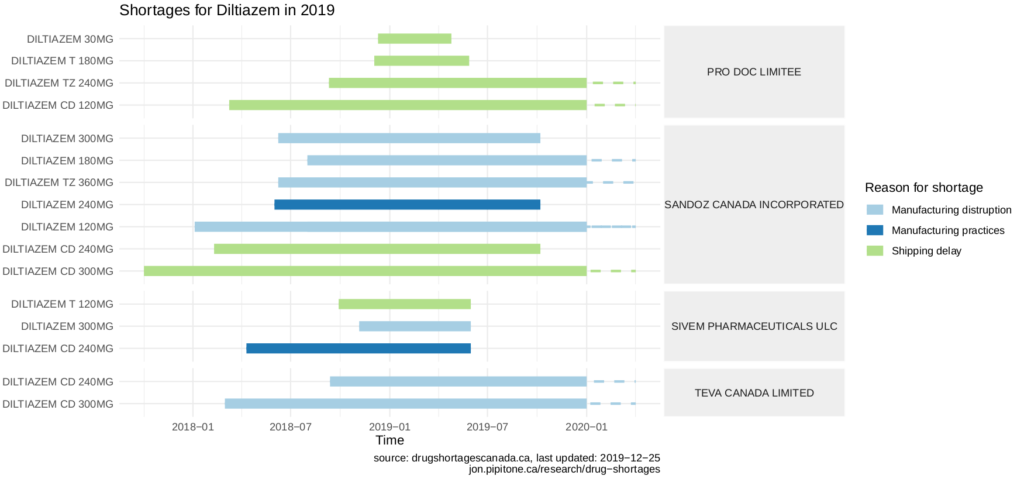 Then I decided to take a deeper dive into one particular medication, and look a bit more closely into related shortages. I think it’s important to look at raw data and get a feel for it. I also worked on putting together a way of visualizing the shortages for a specific medication (well, specific ATC code, in fact). On the EML, diltiazem, a calcium-channel blocker, has had 17 shortages in 2019. Here’s a chart I put together illustrating the timing and details of the shortages: