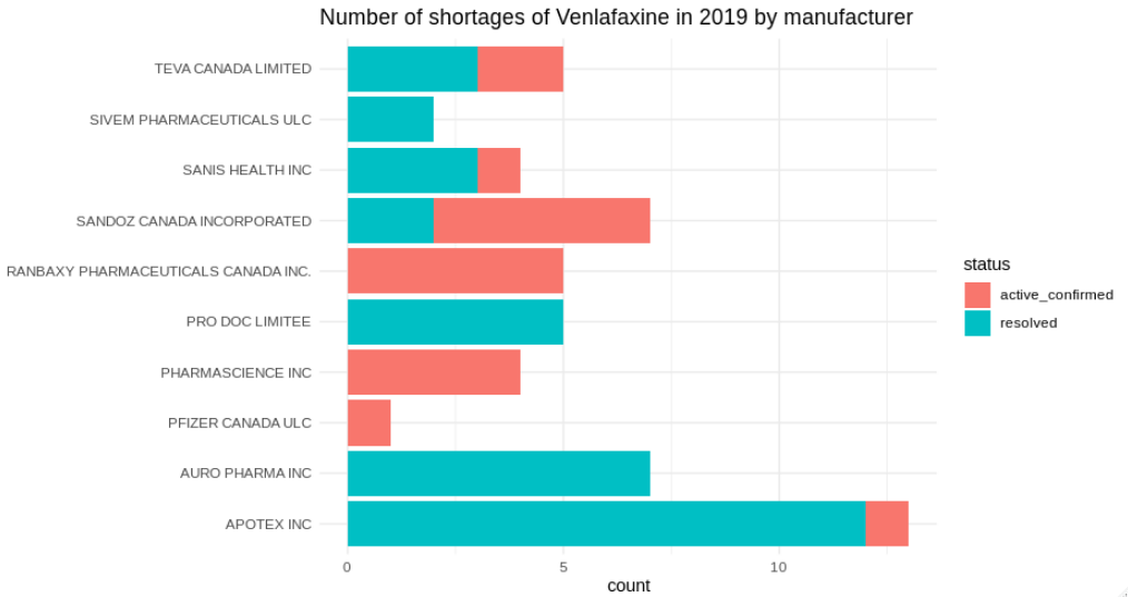 title="Number of shortages of Venlafaxine in 2019 by manufacturer",