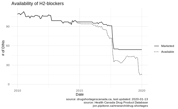 Okay, so a huge drop in marketed drugs, right around the same time that we also see an increase in the number of shortages. If I squint at the top chart, it looks like the number of shortages starts increasing through 2016 just before the drop in 2017. Now, I’m suspicious of the completeness of our shortage data around 2017 since this is also when the shortage database itself came online. The error bars are likely quite large at that point. In any case, we can say that in 2017 there was a drop in marketed h2-blockers, and then in 2019 we see a spike in the number of shortages, especially so for ranitidine. (The drug with the very significant drop in marketed versions is cimetidine, an h2-blocker on the WHO Model essential medicines list.)