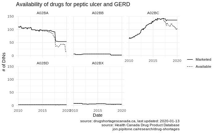 You can clearly see that any effect is really from two classes of drugs: the h2-blockers (A02BA) and the proton-pump inhibitors (A02BC). The PPIs do not have the same sudden loss of marketed drugs and have a smoother increase in shortages over time. But again, we don’t see any evidence of increasing access to alternatives drugs to manage reflux as the shortages roll in. That is, there is no evidence the market is adapting to shortages, and this suggests that these shortages really do matter for access to medications that treat reflux.
