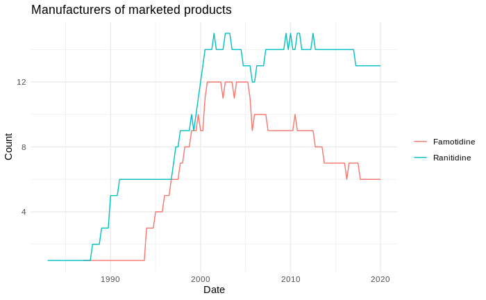 Looks to be that famotidine had its heydey in the early 00s and has since lost manufacturers, where as ranitidine did not. We see that 20 year trend of losing manufacturers is reflected in the decline in the number of marketed famotidine products (see the first chart, note the decline). What we don’t see is a sudden drop in the number of manufacturers around 2017 corresponding to the drop in marketed H2-blockers. This suggests the drop in marketed H2-blockers comes from manufacturers producing fewer versions of the drugs.