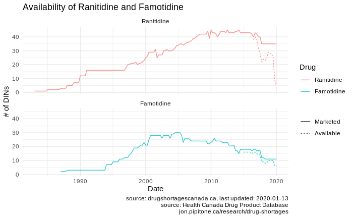 I spent my day investigating two drugs. We were contacted by a CBC reporter asking about shortages of Ranitidine and Famotidine, both drugs used for reflux (why these drugs were chosen by the CBC… that’s an exercise left for the reader). Here is a link (alternate link) to the article published today .
