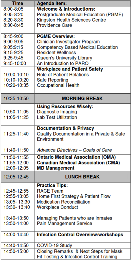 Last Thursday and Friday were my first days at my new job as a resident doctor in the psychiatry post-graduate training program at Queen’s University. As you might expect, these were spent in orientation sessions. Here’s the agenda for the hospital-wide orientation: